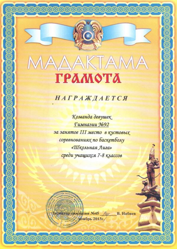№45 гимназияда 7-8 сыныптар арасында баскетболдан өткен "Мектеп лигасында" ұлдар арасынан ІІ орынды, қыз балалар арасынан ІІІ орынды иеленген №92 гимназияның оқушылары марапатталды. Құттық…