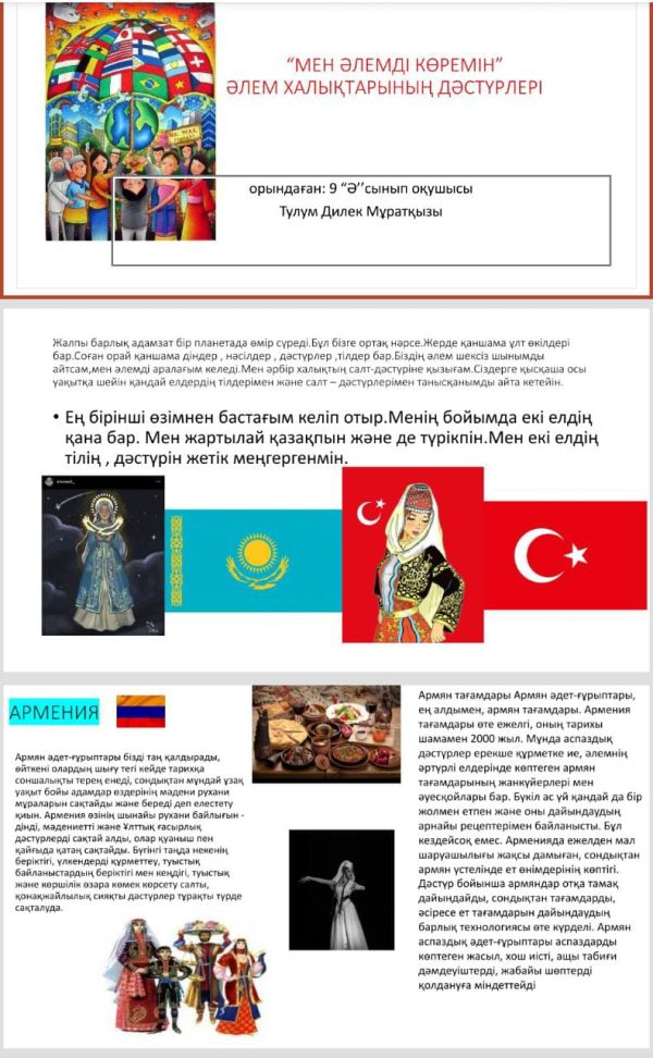 05.12 – 09.12 аралығындағы «Тарихи сауаттылық апталығы» аясында «Мен әлемді көремін: әлем халықтарының дәстүрлері» тақырыбында презентация даярлаған 9 - сынып оқушылары…