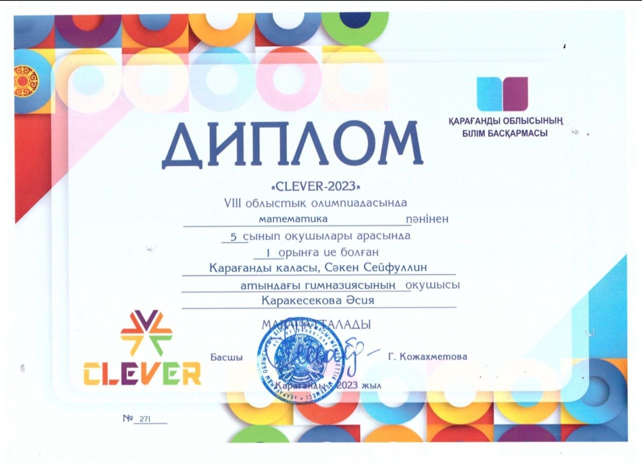 “Clever-2023” Vlll облыстық олимпиадасының қалалық кезеңінде математика пәнінен 1-орын иеленген 5 “Б” сынып оқушысы Қаракесекова Әсияны құттықтаймыз