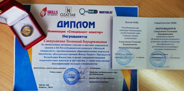 Учитель русского языка и литературы Саққұлақова Толқынай Бауыржановна на республиканском конкурсе молодых специалистов была удостоена звания  «Лучший молодой специалист» и награжден…