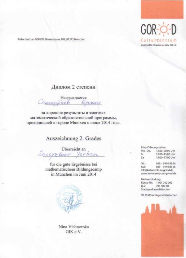 2014 жылы тамыз айында Германияның Мюнхен қаласында өткен математикалық білім беру бағдарламасын игерудегі үздік нәтижеге жеткен №92 гимназияның 3 "В" сынып оқушысы Сансызбаев Ерхан ІІ дәр…