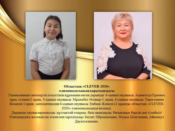 Гимназияның зияткерлік әлеуетінің құрамына енген дарынды 4-сынып оқушысы Амангелді Еркеназ орыс тілінен 2 орын, 5-сынып оқушысы Мұха…