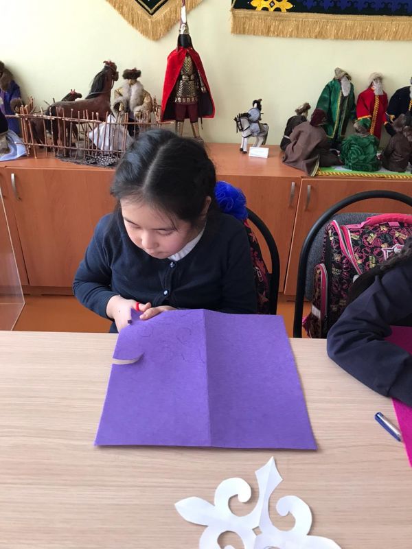 "Шебер қолдар" үйірмесінің оқушылары ұлттық қолөнерді дамытып, фетрдан оюланған қоржын тігу үстінде.