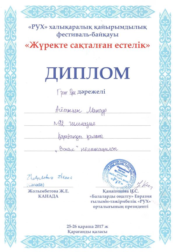 "Жүректе сақталған естелік" фестивалінен №92 гимназияның оқушылары Акболатова Инжу, Алмасбек Каршыга, Мамаев Ислам - І орын иеленсе, Айтыкен Мансур Бас жүлдені жеңіп алды. Жетекшісі: Тыхме…