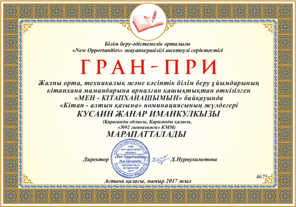 Республикалық білім беру-əдістемелік орталығы «New Opportunities» жауапкершілігі шектеулі серіктестігінің ұйымдастыруымен «Мен - кітапханашымын» байқауында «Кітап - алт…