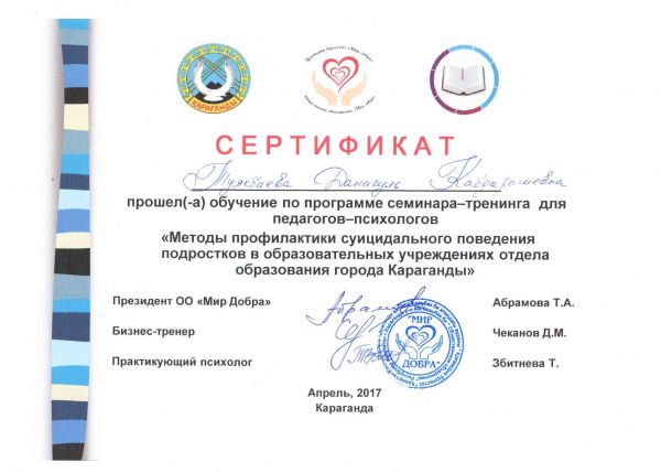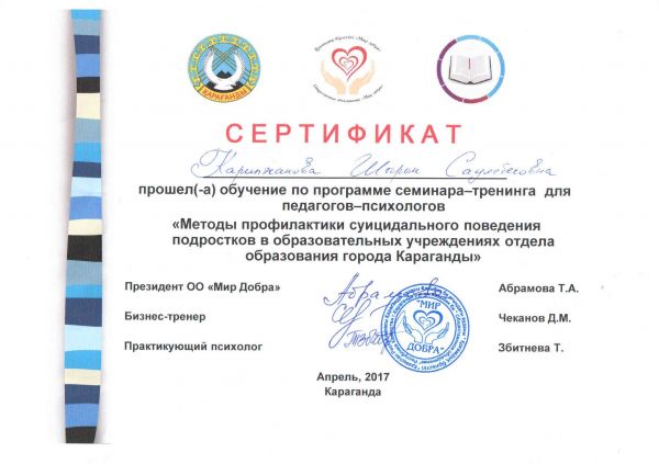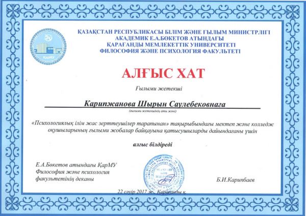 «Психологиялық ілім жас зерттеушілер тарапынан» атты мектеп пен колледж оқушыларының облыстық ғылыми жобалар байқауында №92 гимназияның 11А сынып оқушысы Хайкина Ажар және 11Ә сынып оқуш…