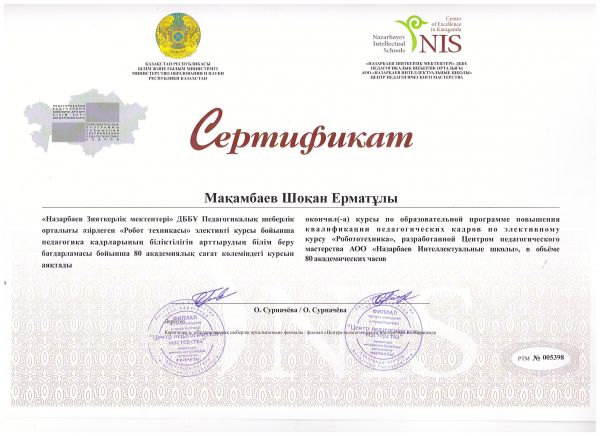 "Информатика" пәнінен "Жас мұғалім мектебі" жобасына белсенді қатысқаны үшін (оқытудың 1 жылы) №92 гимназия мұғалімі Мақамбаев Шоқан Ерматұлы Қарағанды қаласының бі…