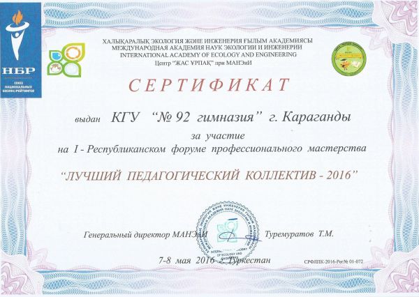 2016 жылдың 7-8 мамыр аралығында Халықаралық Экология және инженерия ғылым академиясының ұйымдастыруымен Түркістан қаласында І Республикалық кәсіби шеберлік «Ең үздік педагогикалық ұжым &ndash…
