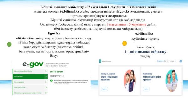Бірінші сыныпқа қабылдау 2023 жылдың 1 сәуірінен 1 тамызына дейін e.bili…