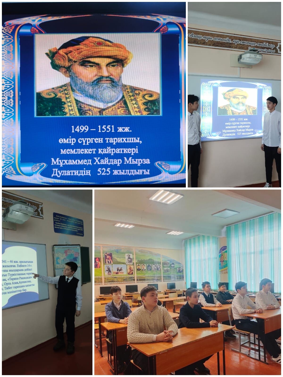 8-9 сынып оқушыларымен тарихшы Мұхаммед Хайдар Дулатидің 525 жылдығына орай танымдық сағат өтті.