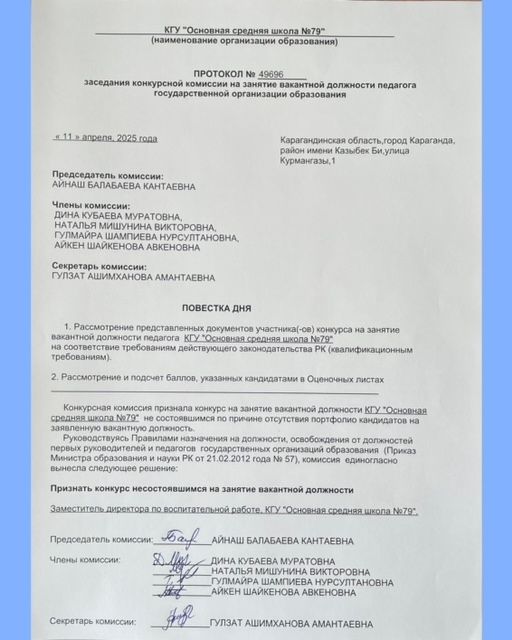Қарағанды облысы білім басқармасының Қарағанды қаласы білім бөлімінің «№79 негізгі орта мектебі» коммуналдық мемлекеттік мекемесі директордың оқу ісі жөніндегі орынбасары лауазымының бос…