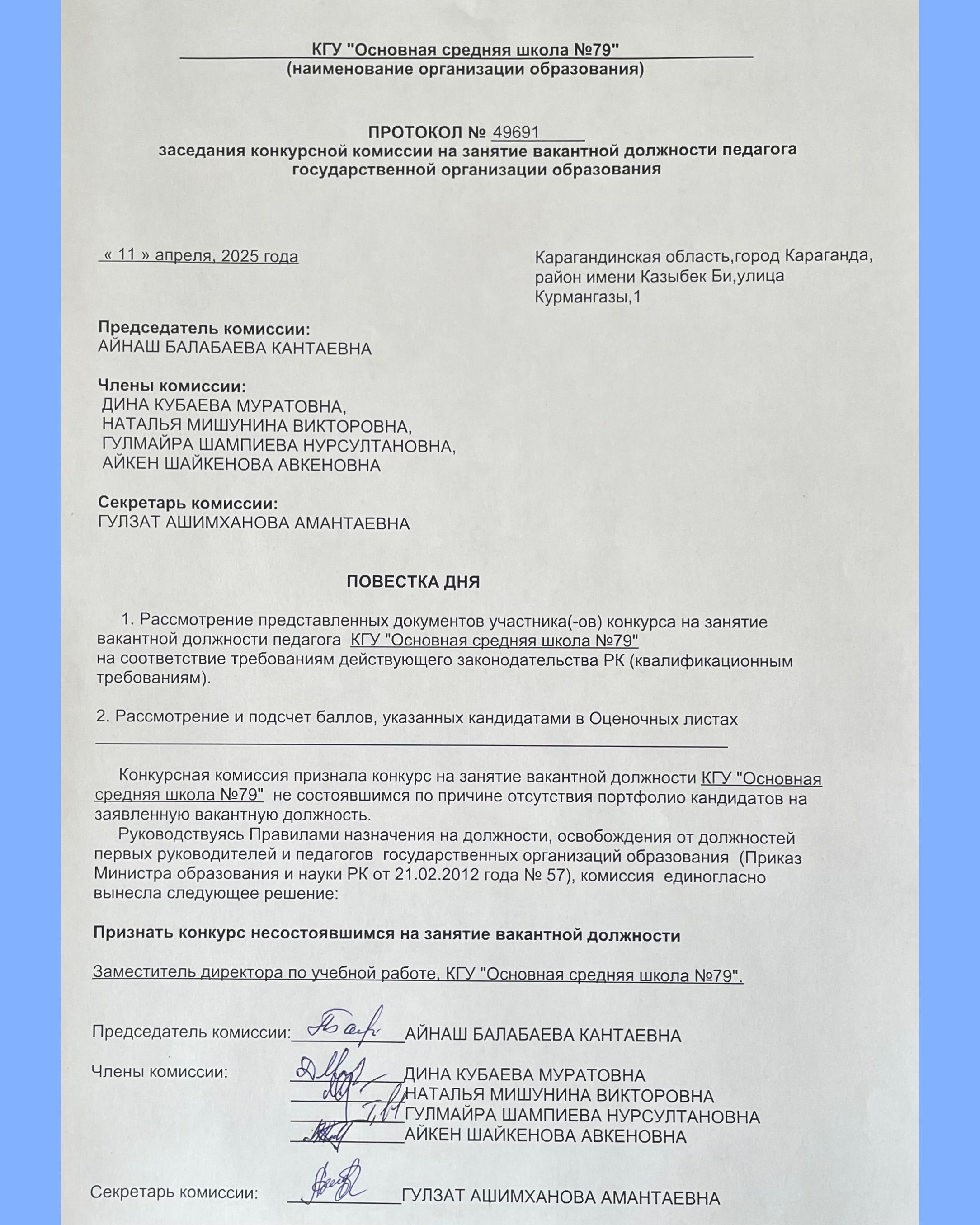 Коммунальное государственное учреждение «Основная средняя школа №79» отдела образования Караганды управления образования Карагандинской области объявляет конкурс на занятие вакантной и в…