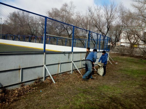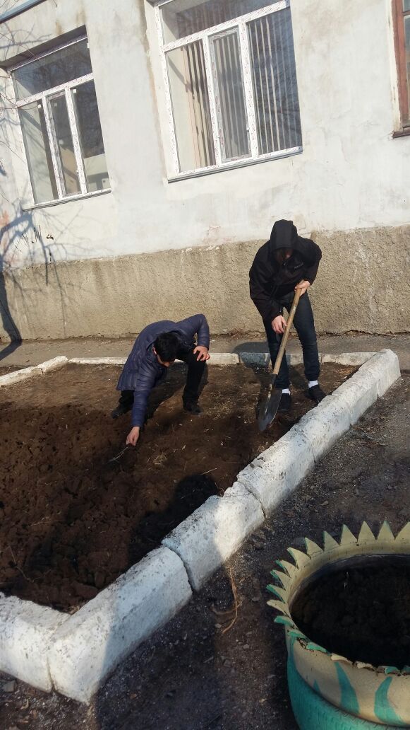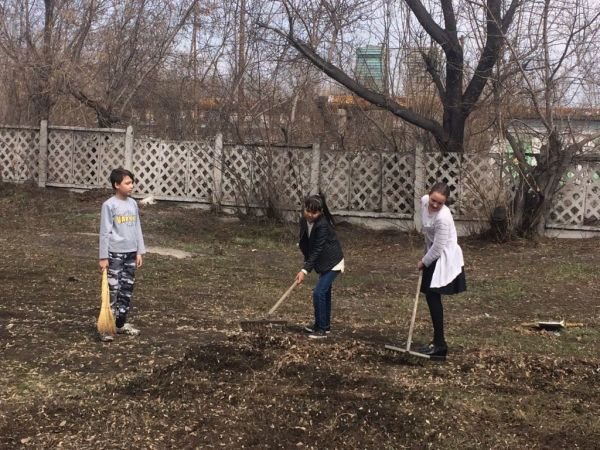 Оқушылар, ұстаздар және басқа да мектеп қызметкерлері мектеп ауласына тазалық жасады.