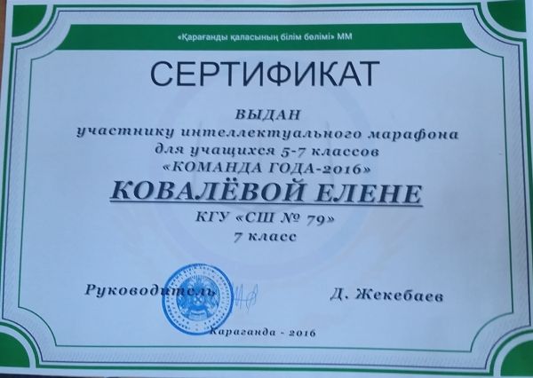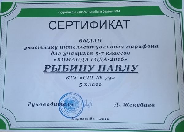 Мектебіміздің 5 "Б" сынып оқушылары "Жыл командасы - 2016" интеллектуалды марафонына қатысып, сертификатпен марапатталды.