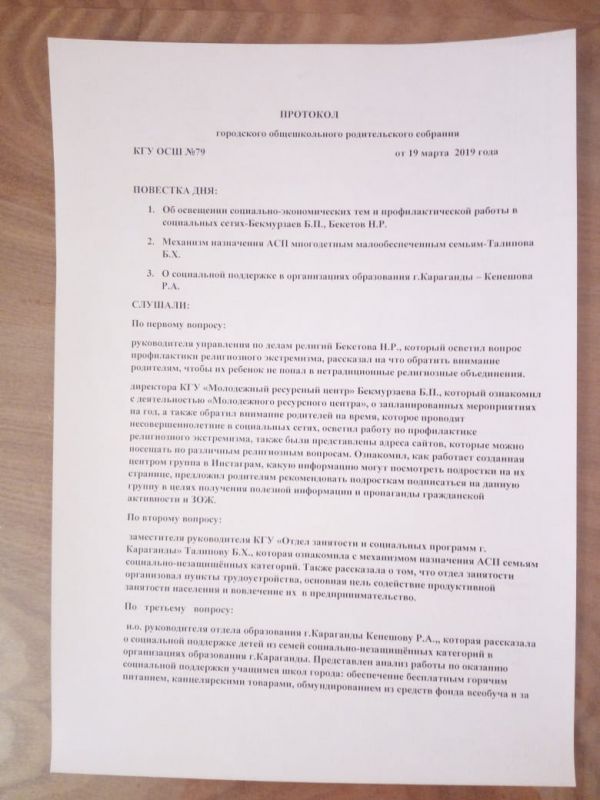 19 марта 2019 года в КГУ "ОСШ №79" прошло общешкольное родительское собрание в режиме on-line.