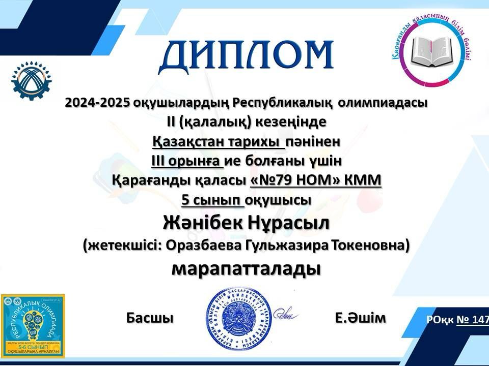 2024-2025 оқушылардың Республикалық олимпиадасы ll қалалық кезеңінде Қазақстан тарихы пәнінен lll орынға ие болған 5 «А» сынып оқушысы Жәнібек Нұрасылды құттықтаймыз!!!