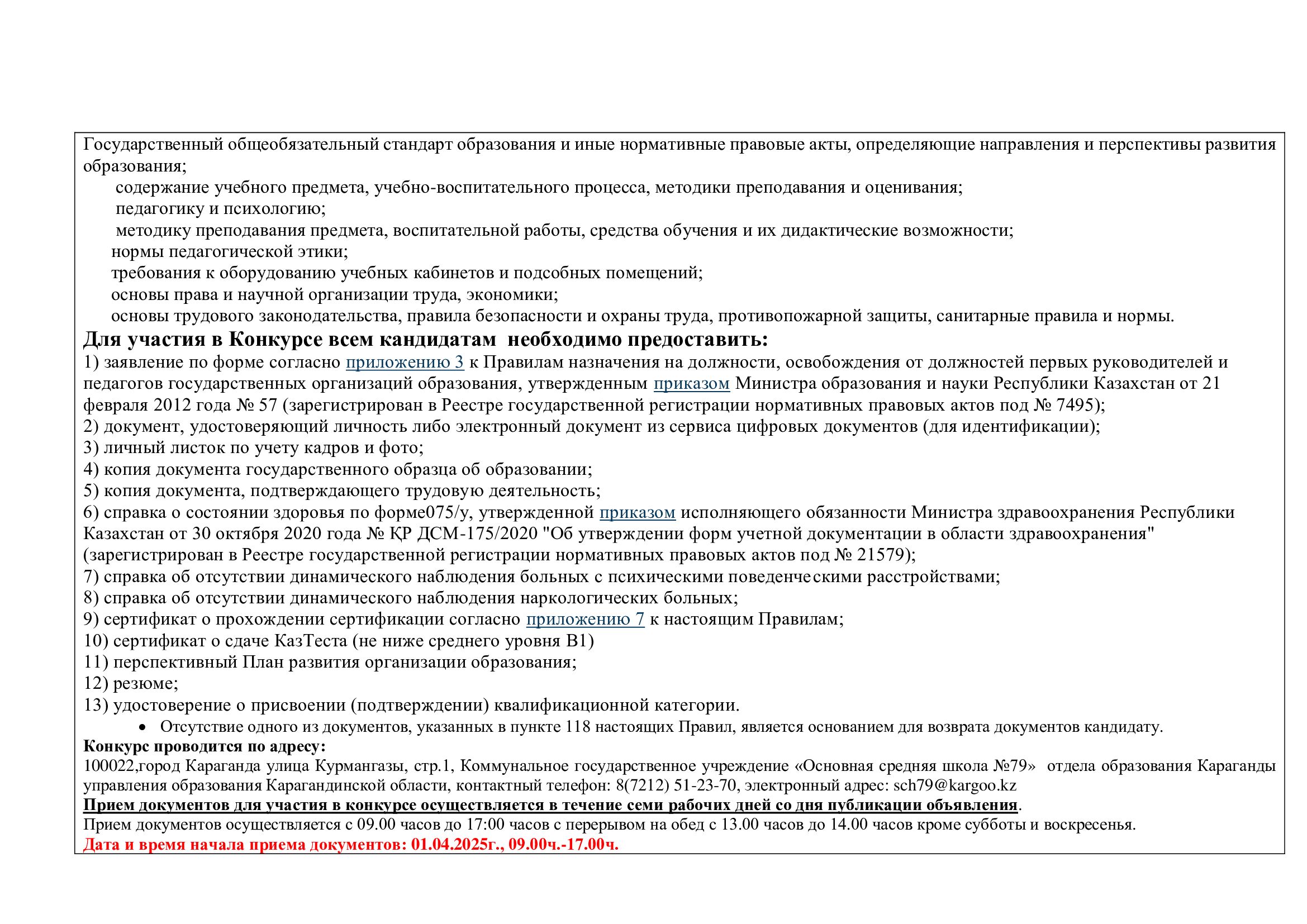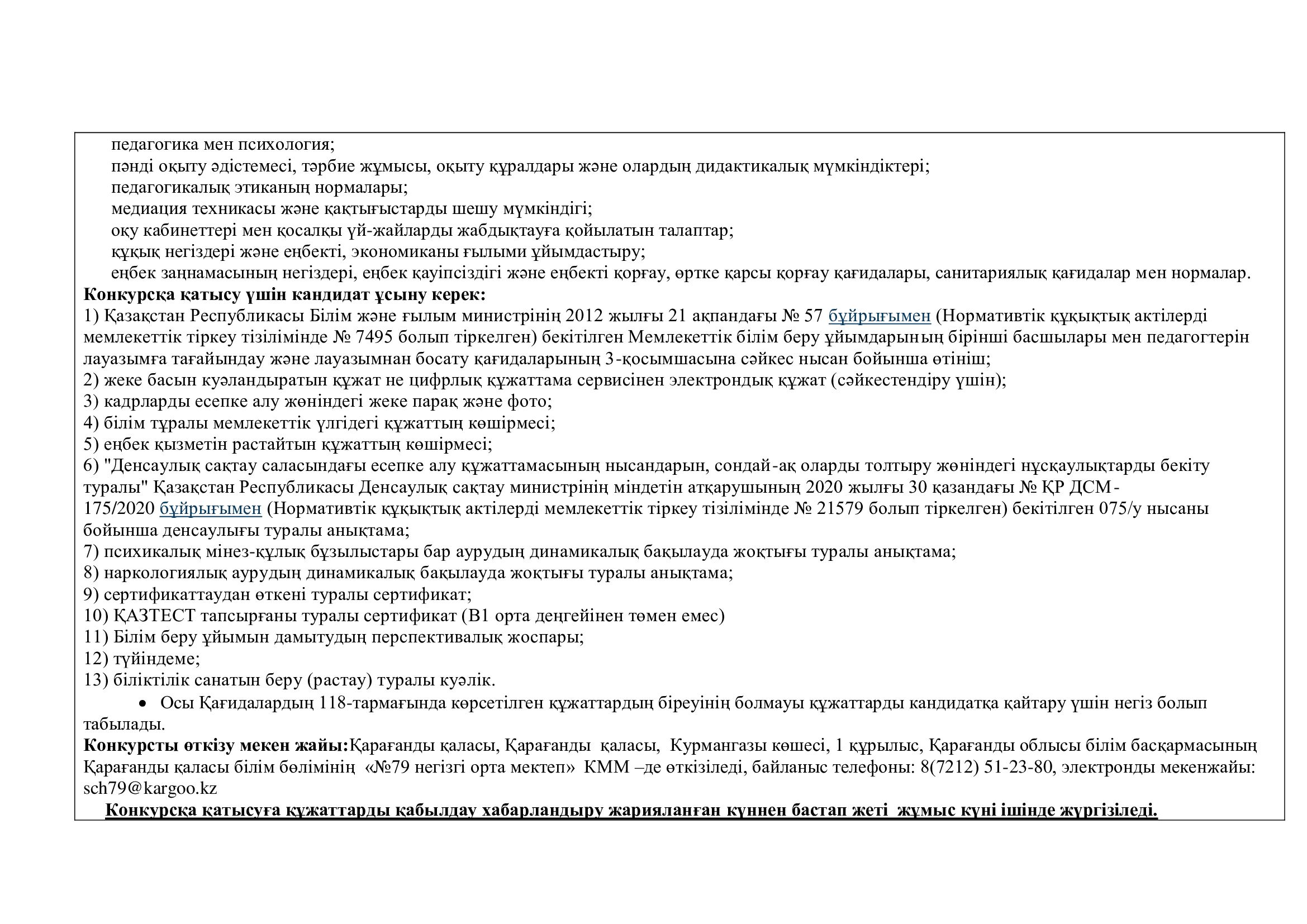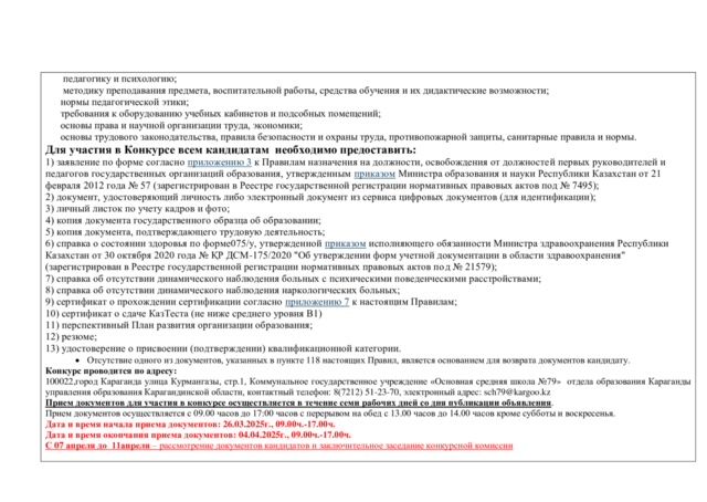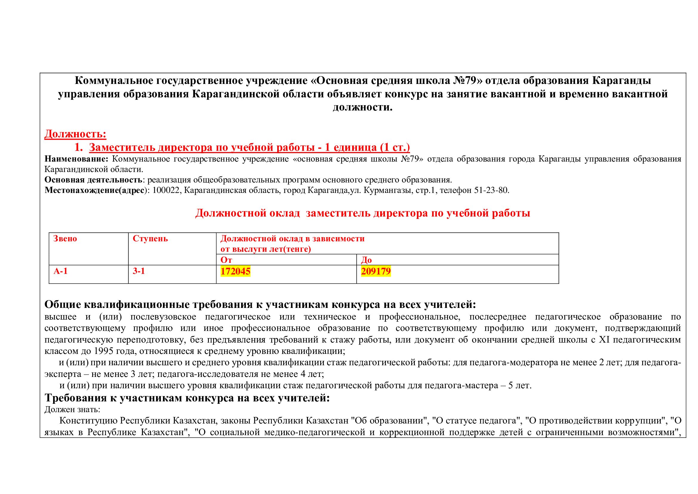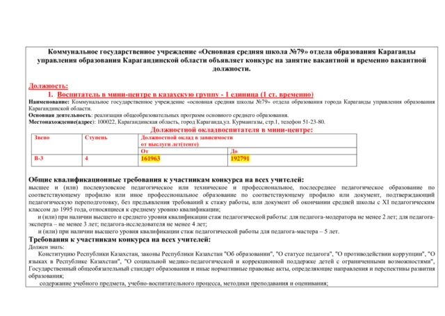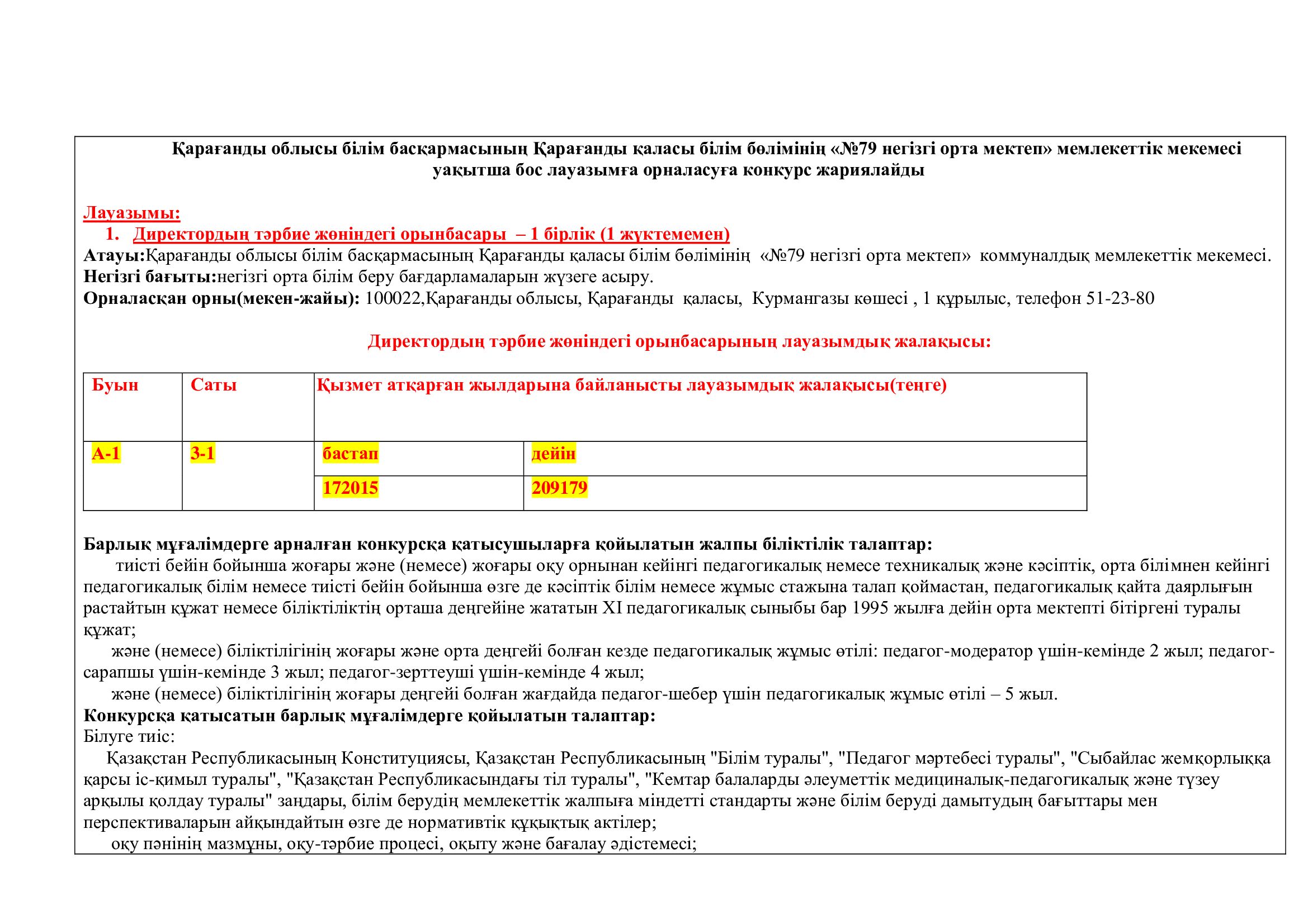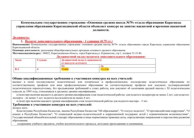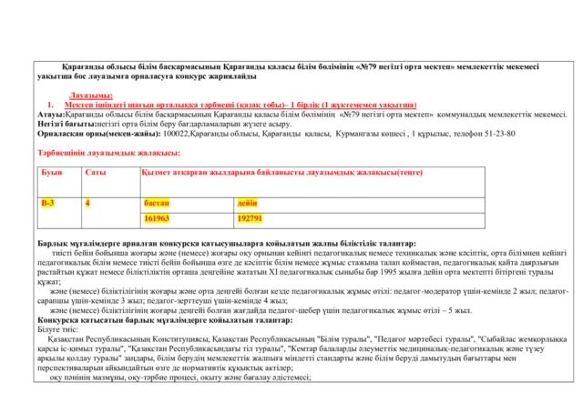 Қарағанды облысы білім басқармасының Қарағанды қаласы білім бөлімінің «№79 негізгі орта мектеп» мемлекеттік мекемесі уақытша бос лауазымға орналасуға конкурс жариялайды