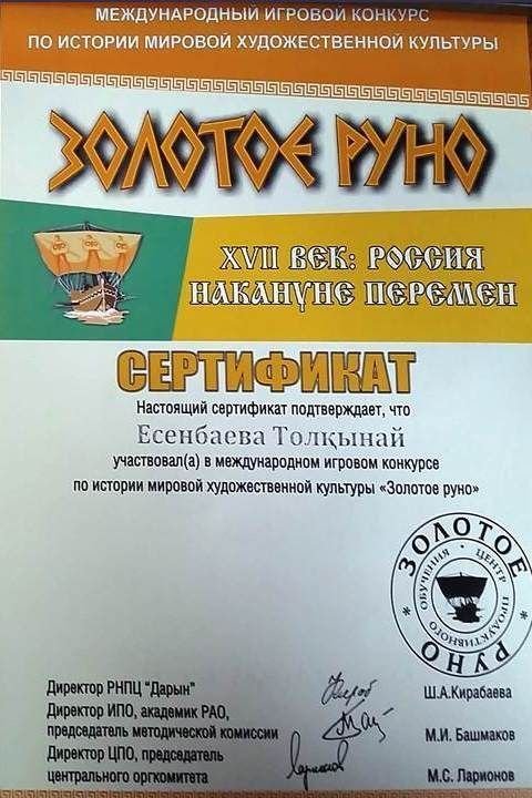 Бейнелеу өнері және сызу пәндері бойынша жалпы білім беру және көркемсурет мектептері оқушылары арасында өткен облыстық олипимадаға қатысқан үшін 9 "Б" сынып оқушысы Байжанова Адема сертиф…