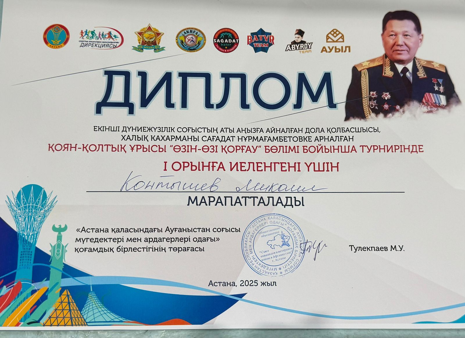 8 «Б» сынып оқушысы Контышев Микаил Астана қаласында өткен екінші дүниежүзілік соғыстың аты аңызға айналған дала қолбасшысы, халық қахарманы Сағадат Нұрмағамбетовке арналған қоян-қолтық…