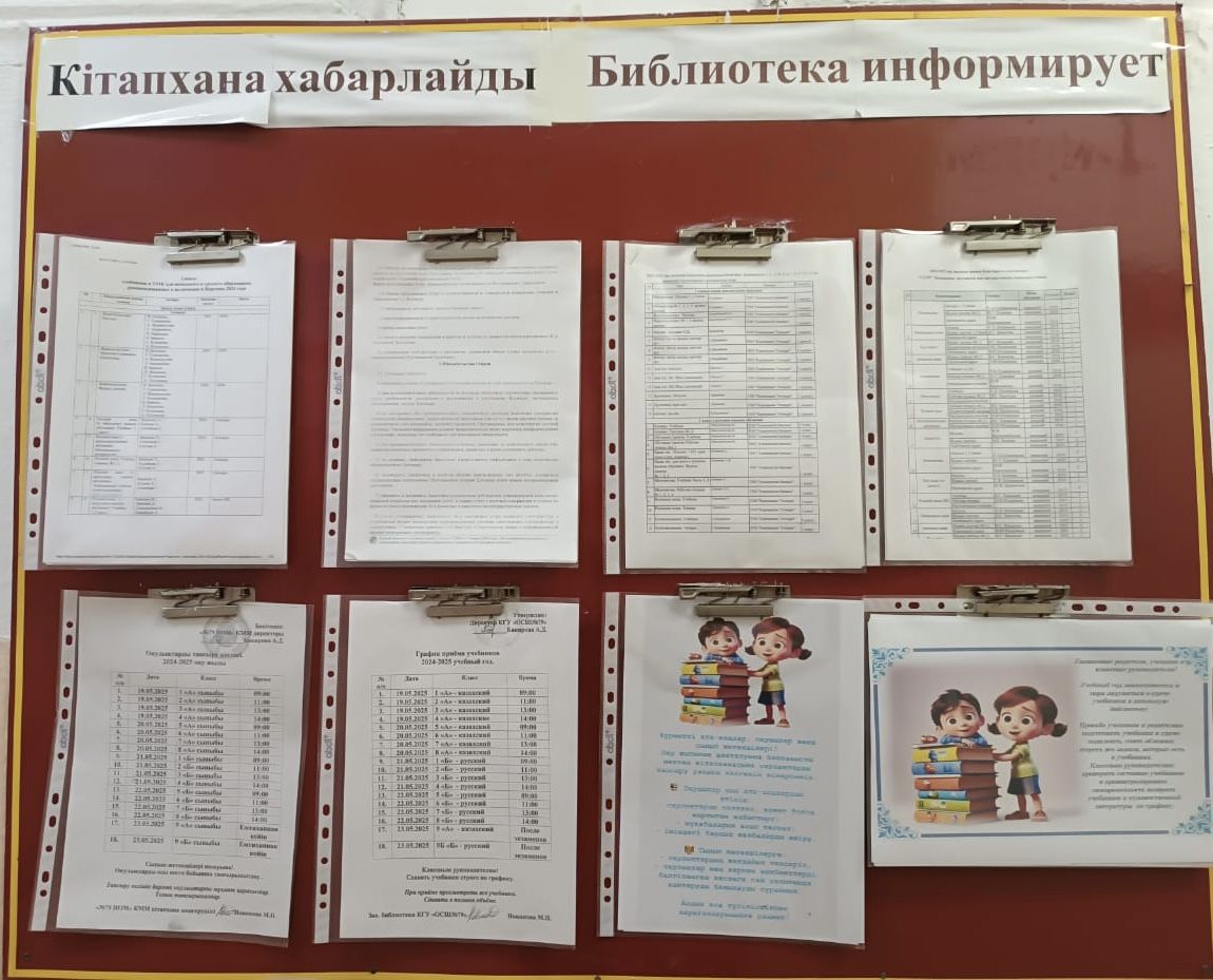 Кітапхана меңгерушісі Новикова М.П. «Кітапхана хабарлайды» стендін әзірледі, онда «Оқулықтарды кітапханаға қайтару кестесі» туралы ақпарат көрсетілді.