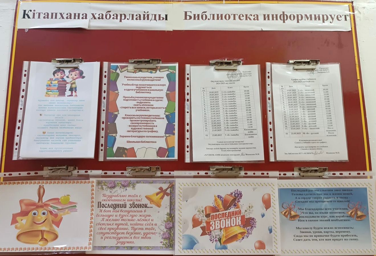 Кітапхана меңгерушісі Новикова М.П. 1-9 сынып оқушыларына арналған «Кітапхана хабарлайды» стендін «23 мамыр соңғы қоңырау» ақпаратымен толықтырды.