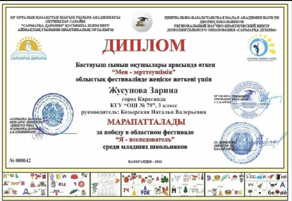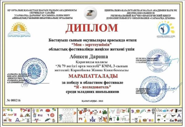 2-4 сынып оқушылары "Мен - зерттеуші" атты облыстық фестиваліне қатысып, жеңіске жетіп дипломдармен және алғыс хаттармен марапатталды. Сынып жетекшілері Абдрахманова Д.А., Карипбаева Ж.Қ.,…