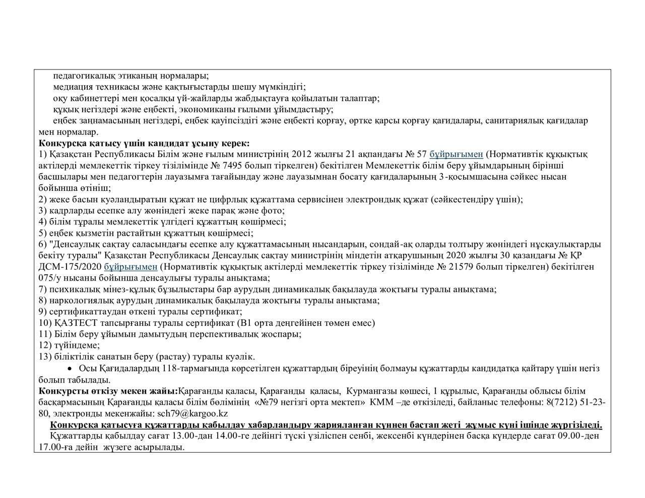 Қарағанды облысы білім басқармасының Қарағанды қаласы білім бөлімінің «№79 негізгі орта мектеп» мемлекеттік мекемесінде бос лауазымға орналасуға конкурс жариялайды.