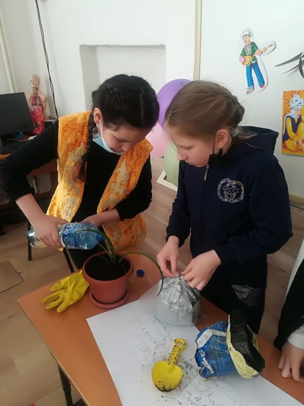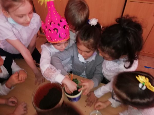 4 «Б» класса подарили комнатный цветок, который посадили своими руками.