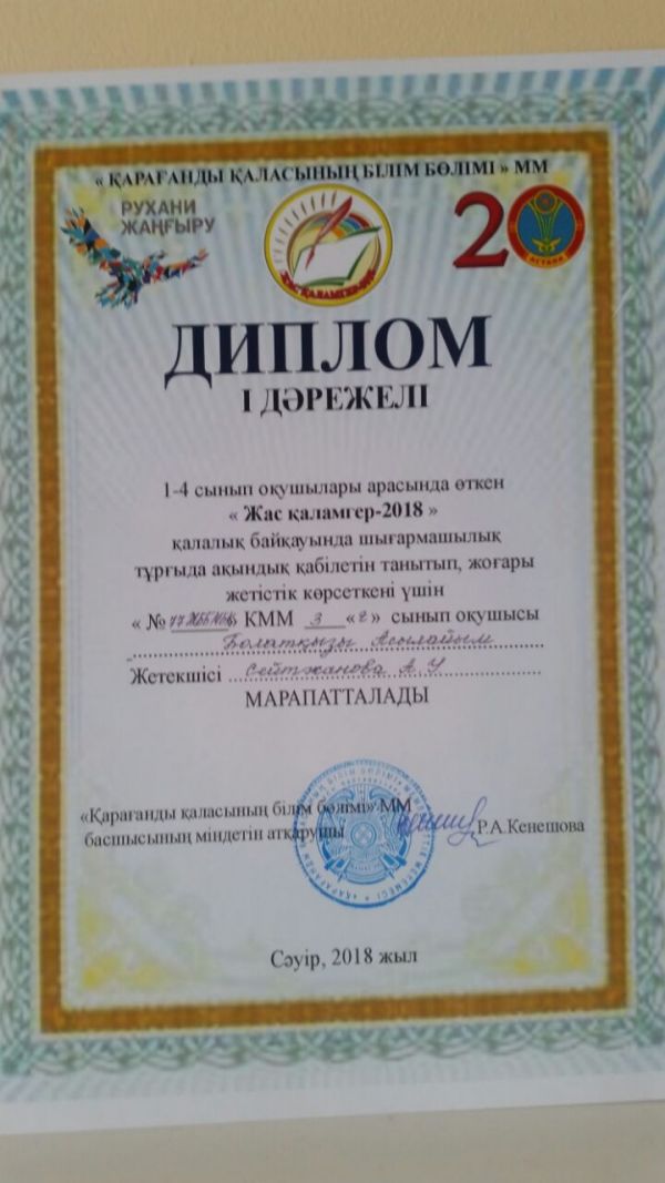 1-4 сынып оқушылары арасында өткен "Жас қаламгер-2018" қалалық байқауында шығармашылық тұрғыдағы ерекше қабілеті үшін мектебіміздің 3 "Ғ" сынып оқушысы Райымбек Кәусар  Мада…