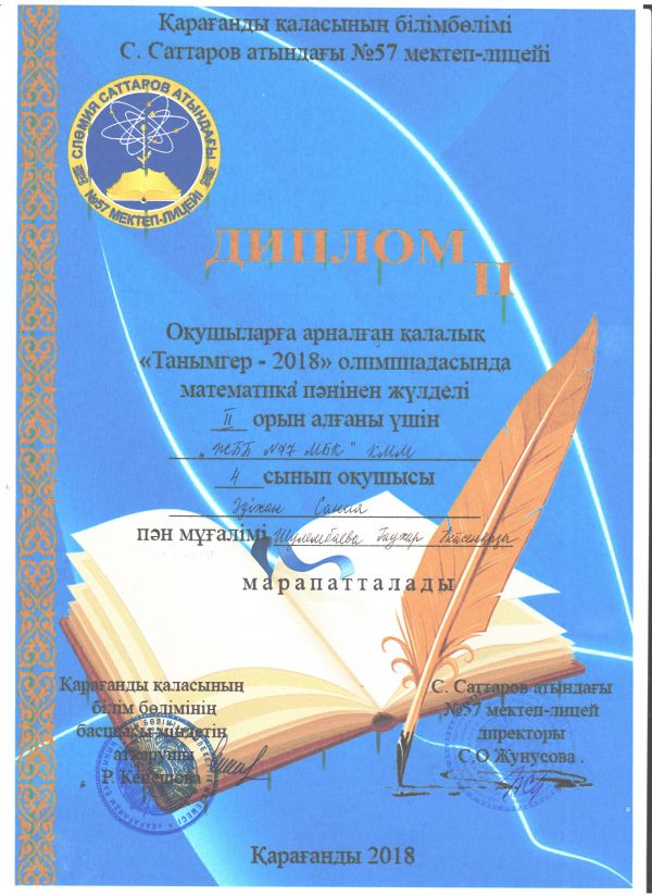 Оқушыларға арналған қалалық "Танымгер-2018" олимпадасында математика, ағылшын тілінен жүлделі II,III орын алған оқушыларымыз:  4 сынып оқушысы Әдіхан Сания,  6 сынып оқушысы Саби…