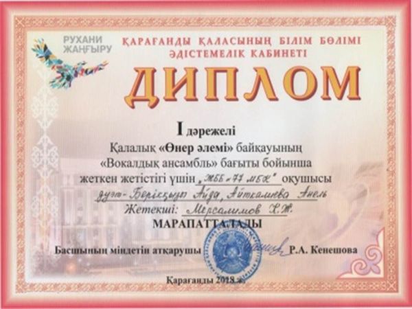 "Өнер әлемі" атты қалалық музықа мұғалімдерінің шығармашылық байқауына белсене қатысып, жүлделі 1-дәрежелі дипломға ие болған …