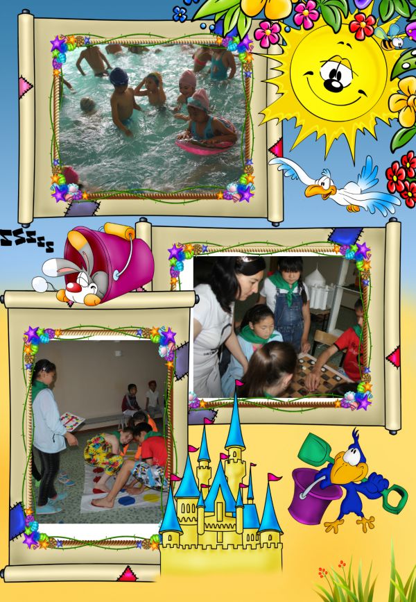 «Ғажайып әлем» сауықтыру лагері өз жұмысын жалғастыруда. Бассейнде суда жүзіп, таңғы астарын ішкен соң балалар «Сиқырлы бояу», «Құзға өрмелеу», «…