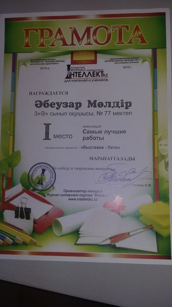 Поздравляем ученицу 4 "Ә" класса Әбеузар Мөлдір за занятое I место в творческом конкурсе " Выставка- лето".