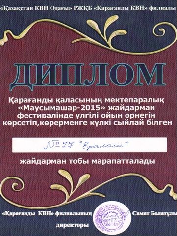 Қарағанды қаласының мектепаралық "Маусымашар-2015" жайдарман фестивалінде үлгілі ойын өрнегін көрсетіп, көрерменге күлкі сыйлай білген үшін ЖББ №77 МББК "Ералаш" жайдарман тобы Д…