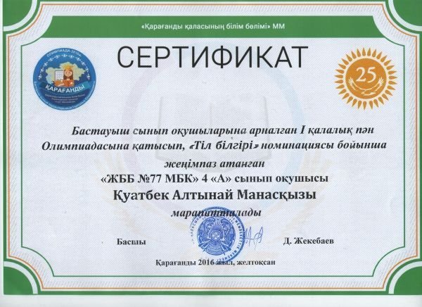 Бастауыш сынып оқушыларына арналған I қалалық пән Олимпиадасына қатысып, "Тіл білгірі" номинациясы бойынша жеңімпаз атанған 4 "А" сынып оқушысы Қуатбек Алтынай Манасқызын құттықт…
