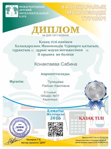 Қазақ тілі пәнінен Халықаралық Монопәндік Турнирге оқушыларды дайындағаны үшін Тулешева Райхан Каиповна, Куйкалакова Балжан Кайржановнаға алғыс білдірілді.