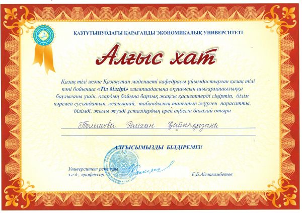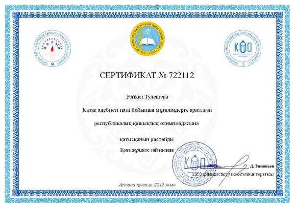 Қазақ әдебиеті пәні бойынша мұғалімдерге арналған Республикалық қашықтық олимпиадасына қатысып, қола жүлдеге сай нәтиже көрсеткен  қазақ тілі мен әдебиеті пәнінің мұғалімі Төлешева Райхан Қайып…