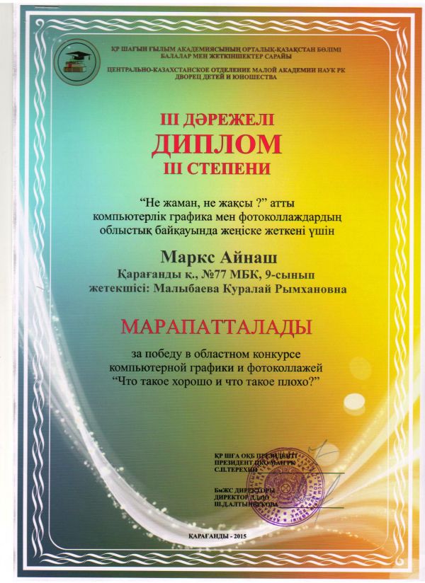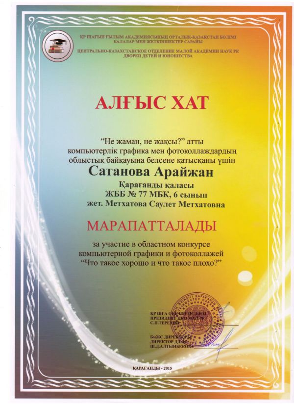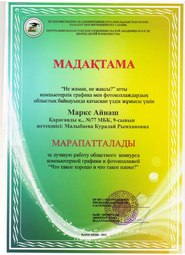ҚР шағын ғылым академиясының орталық- Қазақстан бөлімі мен жеткіншектер сарайы ұйымдастырған  "Не жаман, не жақсы?" атты компьютерлік графика мен фотоколлаждардың облыстық байқауында…