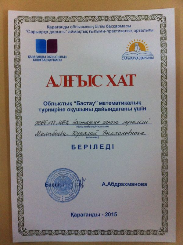 Облыстық бастауыш сынып оқушылардың арасында «Бастау» математикалық турнирінде 1 орын алған үшін 2 сынып оқушысы Төребаева Адиля мен 4 сынып оқушысы Амангелді Інк…