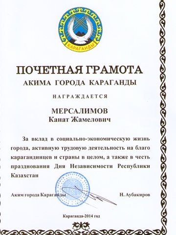 ҚАРАҒАНДЫ ҚАЛАСЫ ӘКІМІНІҢ ҚҰРМЕТ ГРАМОТАСЫ