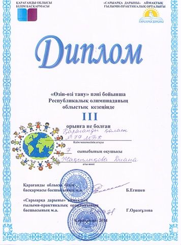 ЖББ № 77 кешенінің 7 сынып оқушысы Жақсылықова Диана " Өзін- өзі тану" пәні бойынша Республикалық олимпиаданың облыстық кезеңінде 3 орынға ие болып, Дипломмен марапатталды!
