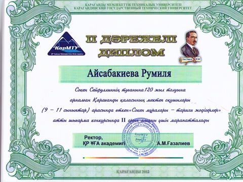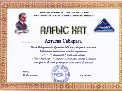 Сәкен Сейфуллиннің 120 жыл толуына арналған Қарағанды қаласының мектеп оқушылары арасында өткен  " Сәкен мұралары- тарихи жәдігерлер" атты шығарма конкурсында 10 сынып оқушысы Сарқыто…