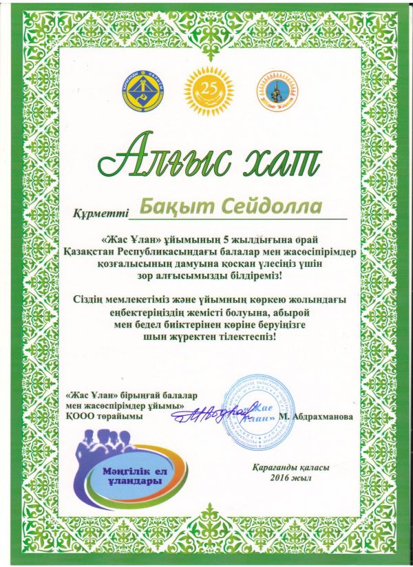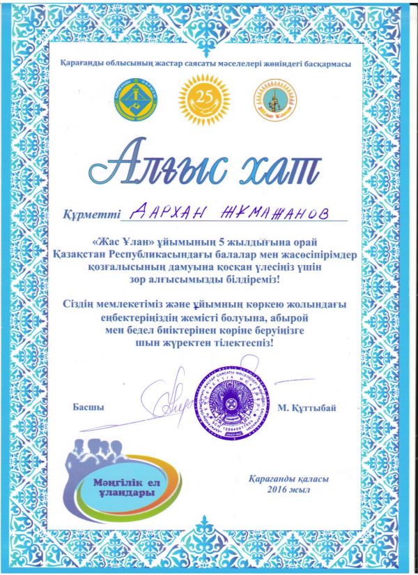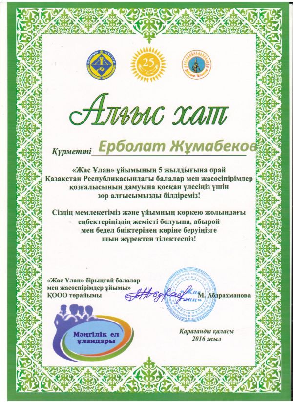 «Жас Ұлан» ұйымының 5 жылдығына орай ұйымдастырылған «Мәңгілік ел ұландары» атты республикалық форумға мектебіміздің аға тәлімгері &…