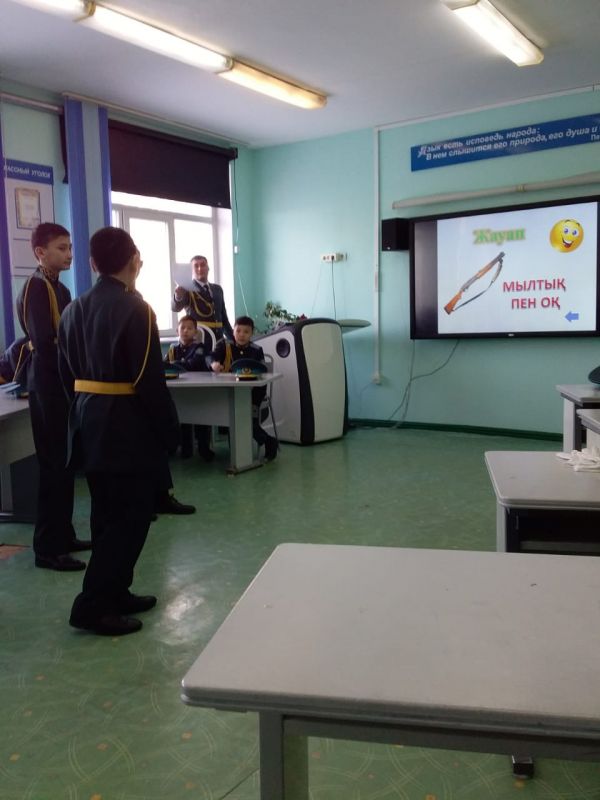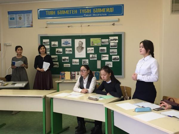 Жас маман Қонтай Айдос Бауыржанұлының 7 "Б" сынып оқушылары арасында "1001 мақал, 101 жұмбақ" атты сайыс түрінде өткізген ашық сабағынан көрініс.