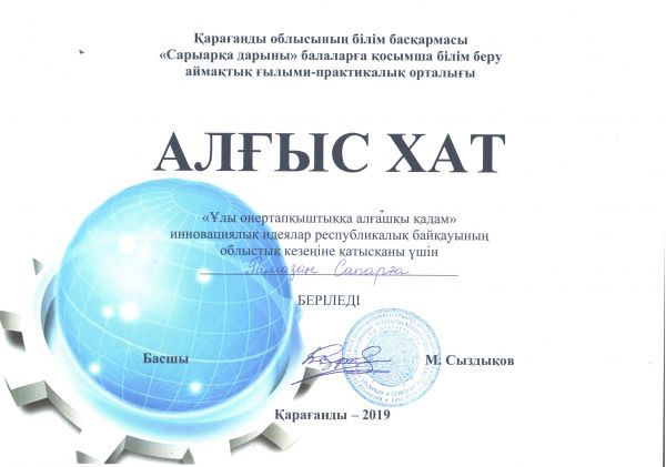 Қарағанды қаласының білім бөлімі әдістемелік кабинетімен ЖББ №77 МБК 7 "а" сынып оқушысы Зайров Мейірман "Алғырлар-2019" ғылыми жобасындағы жаңашыл ізденістері үшін дипломм…
