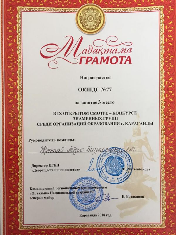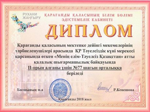 Қарағанды қаласының мектепке дейінгі мекемелерінің тәрбиеленушілердің арасында өткен "Менің елім-Тәуелсіз Қазақстан" атты қалалық шығармашылық байқауына қатысқан мектебіміздің бүлдіршіндер…