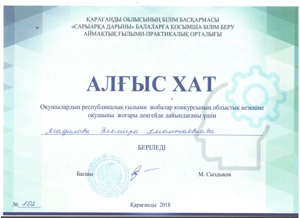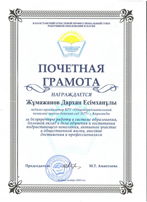 Казахстанский Отраслевой Профессиональный союз работников образования и науки Республики Казахстан наградил Почетной Грамотой педагога- организатора нашей школы ЖҰМАЖАНОВА ДАРХАНА ЕСІМХАНҰЛЫ! &…