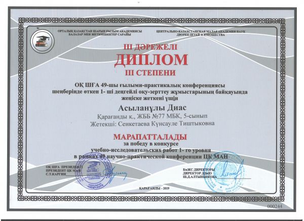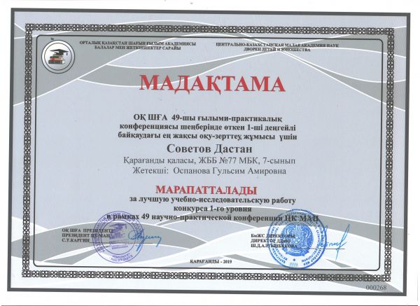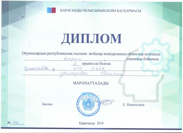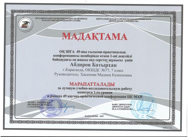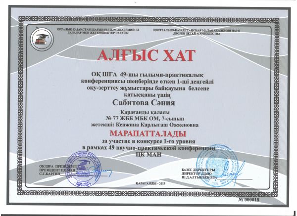 ОҚ ШҒА 49-шы ғылыми- практикалық конференция шеңберінде өткен 1- ші деңгейлі оқу- зерттеу жұмыстарының байқауында мектебіміздің оқушылары жеңіске жетіп, дипломдармен марапатталды!