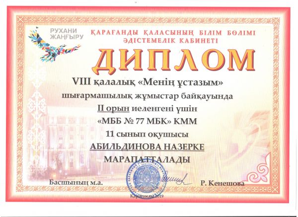 VIII қалалық "Менің ұстазым" атты шығармашылық жұмыстар байқауына қатысып, 11 сынып оқушылары Амантай Майя III орын, Абильдинова Назерке II орын иеленді!