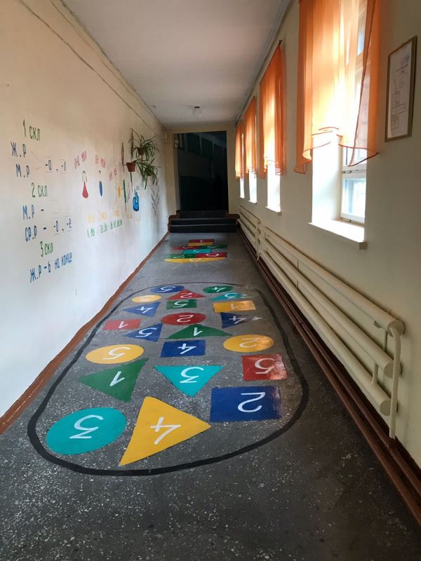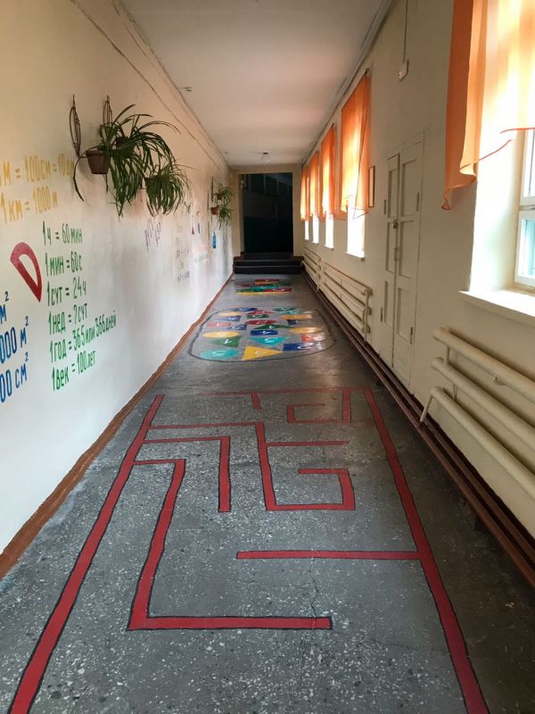 В новом учебном году, в фойе школы, для учащихся начального звена,представлена игровая зона на полу. На стенах же размещены формулы и правила предметов математики и русского языка.